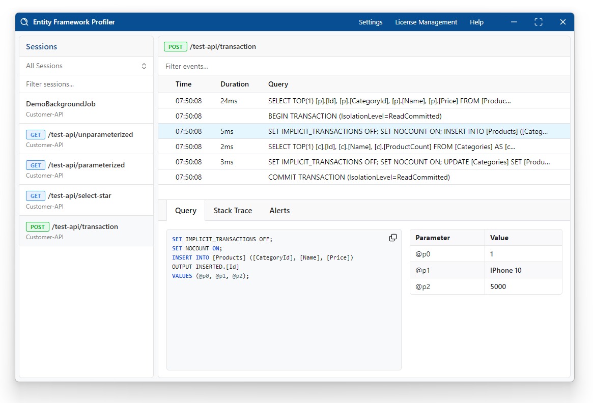 Profiler streams EF Core commands live to the desktop interface. Understand what your app is doing instantly with live sessions, query insights, stack traces, and alerts.